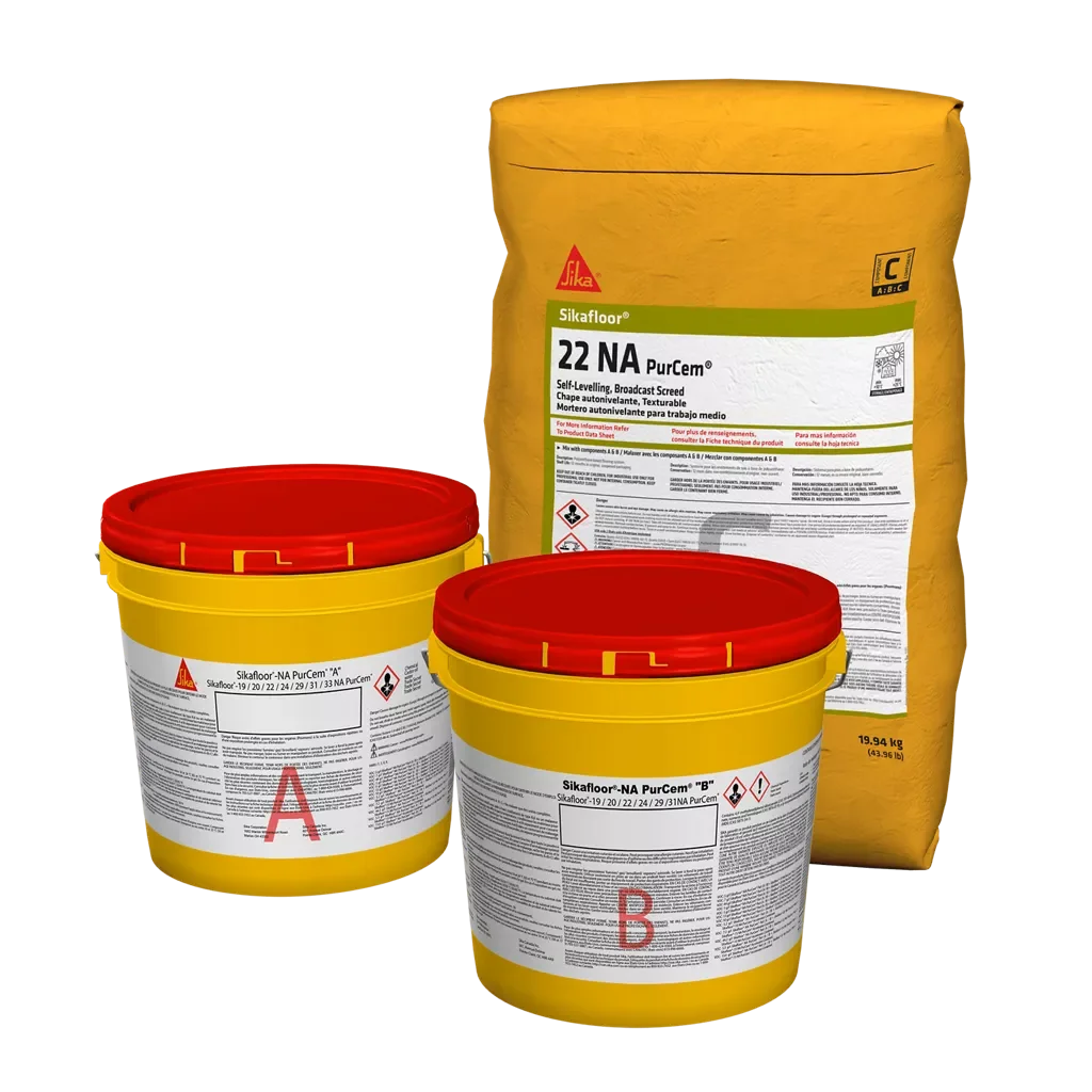 Sikafloor®-22 NA PurCem® is a self-leveling, solid color, three component, cementitious urethane mortar designed to provide excellent resistance to abrasion, impact, and chemical attack. Sikafloor®-22 NA PurCem® is broadcast with dried quartz sand and sealed with Sikafloor®-31NA PurCem to produce a solid color finish, or can be broadcasted with colored quartz aggregate and sealed with Sikafloor resinous flooring products for a decorative finish. The system is typically installed at 3/16" to 1/4" (188 to 250 mils) thickness.